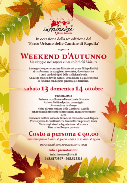 Gita a Rapolla – 13 e 14 ottobre 2012 Posted by Interferenze 0 Alla scoperta dei colori, dei sapori e della storia del territorio di Rapolla in occasione della 10° edizione del “Parco urbano delle cantine”. Questo slideshow richiede JavaScript. Vota:Condividi: Fai clic qui per stampare (Si apre in una nuova finestra) Stampa Fai clic per inviare un link a un amico via e-mail (Si apre in una nuova finestra) E-mail Tweet Correlati