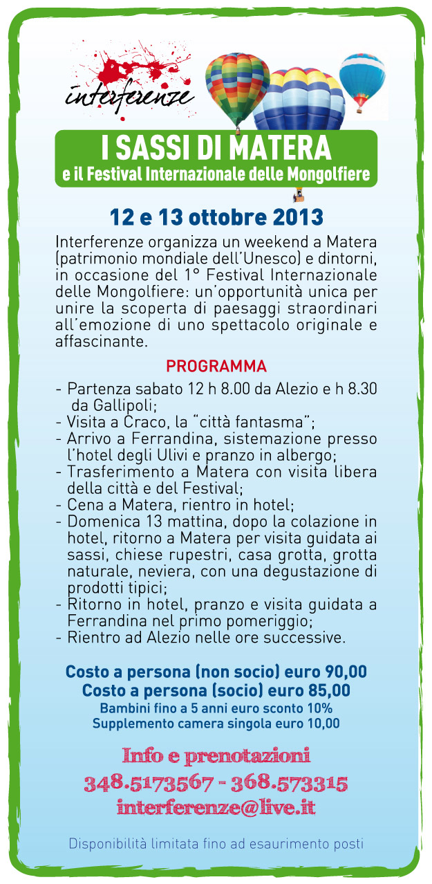 Un weekend a Matera (patrimonio mondiale dell’Unesco) e dintorni, in occasione del 1° Festival Internazionale delle Mongolfiere: un’opportunità unica per unire la scoperta di paesaggi straordinari all’emozione di uno spettacolo originale e affascinante.