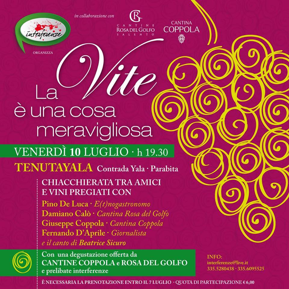 Si apre il 10 luglio con una chiacchierata tra amici e vini pregiati nella suggestiva cornice di Tenuta Yala, insieme a Pino De Luca, e(t)nogastronomo; Damiano Calò, Cantine Rosa del Golfo; Giuseppe Coppola, Cantina Coppola e il canto di Beatrice Sicuro. Coordina Fernando D’Aprile, giornalista.