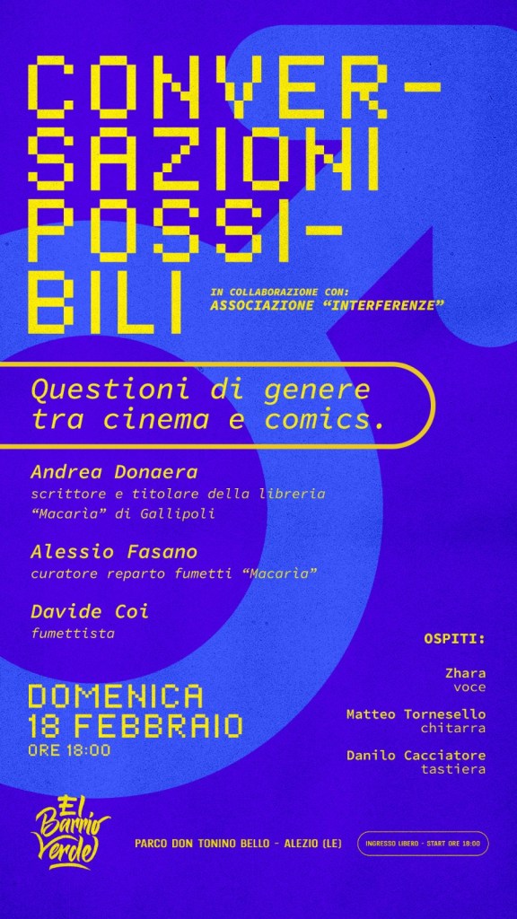 Con la partecipazione di Andrea Donaera, scrittore e titolare della libreria Macarìa di Gallipoli; Alessio Fasano, curatore del reparto fumetti Macarìa; Davide Coi, fumettista.